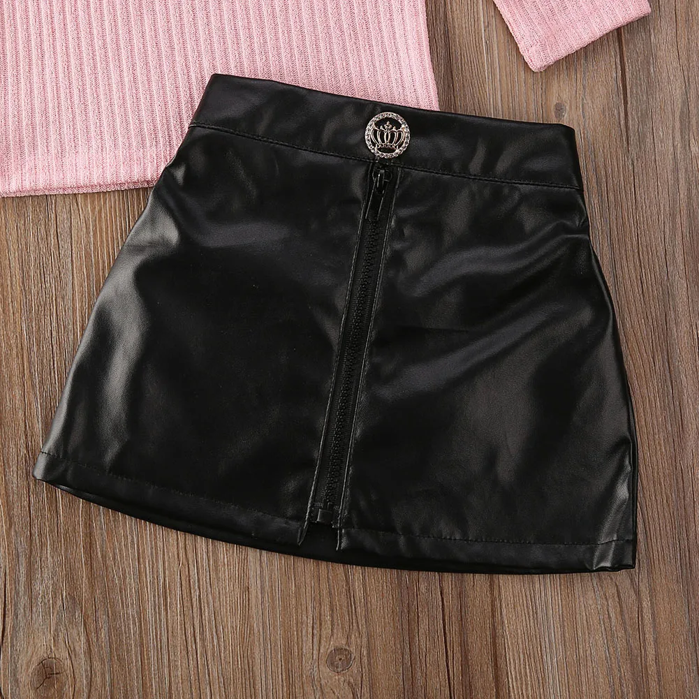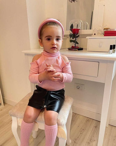 An off-shoulder knitted sweater in a cotton blend. It is made of high-quality material. The material is soft and gentle to the baby's skin.  This top comes with a matching A-line mini skirt.