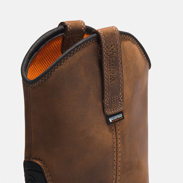 Our True Grit work boot features ultimate comfort, premium waterproof protection, and Western-inspired styling that looks just as at home on the ranch as it does on industrial job sites. The slip-resistant, rubber lug outsole features a Ladder Lock™ heel that grips ladder rungs, plus we’ve added an Anti-Fatigue Technology footbed for shock absorption and energy return and ExoSpine™ technology that offers enhanced durability with lightweight TPU construction for lasting structure, enhanced heel fit for all-day comfort, and abrasion-resistant “kick-off” backing for easy boot removal. The premium waterproof leather upper has an internal waterproof membrane for ultimate protection from water intrusion and blood-borne pathogen resistance, plus safety features like an asymmetrical composite safety toe powered by Carbon Shield™ technology and electrical hazard protection. The breathable, moisture-wicking lining with odor control treatment is made of ReBOTL™ material containing at least 50% recycled plastic.