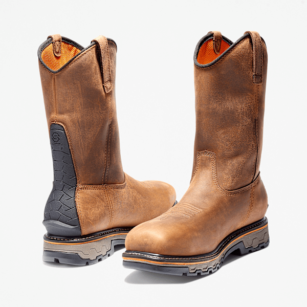 Our True Grit work boot features a Premium Timbthterland® leather upper for ultimate comfort, premium waterproof protection, and Western-inspired styling that looks just as at home on the ranch as on industrial job sites. The slip-resistant, rubber lug outsole features a Ladder Lock™ heel that grips ladder rungs, plus we've added an Anti-Fatigue Technology footbed for shock absorption and energy return and ExoSpine™ technology that offers enhanced durability with lightweight TPU construction for lasting structure, enhanced heel fit for all-day comfort, and abrasion-resistant “kick-off” backing for easy boot removal. Our breathable, moisture-wicking lining with odor control treatment is made of ReBOTL™ material containing at least 50% recycled plastic.