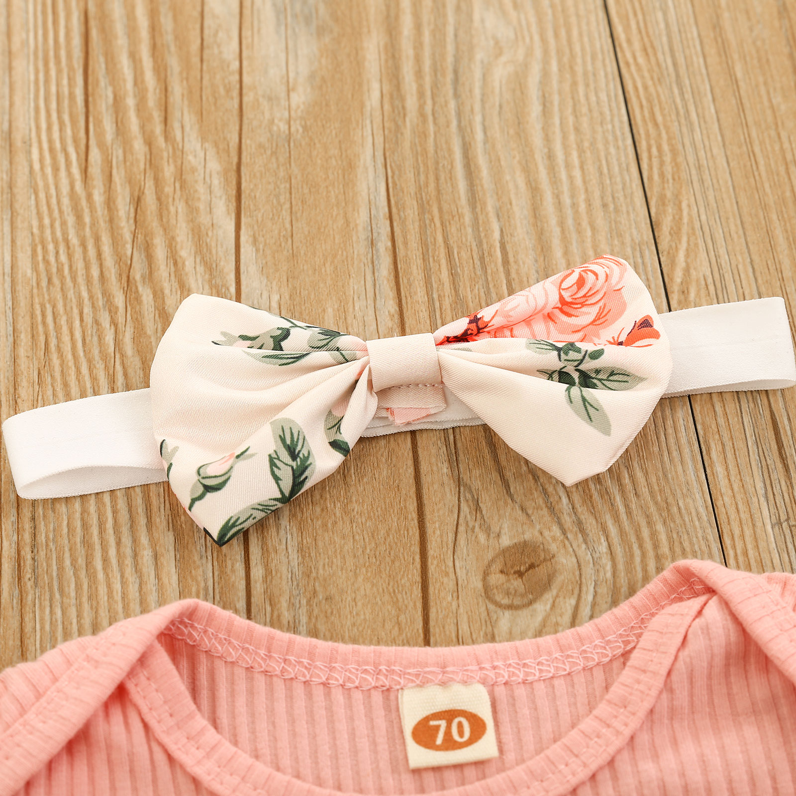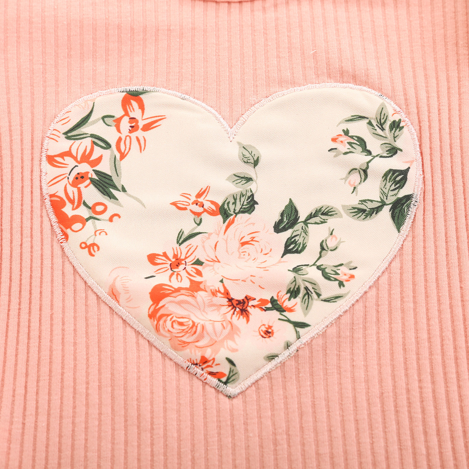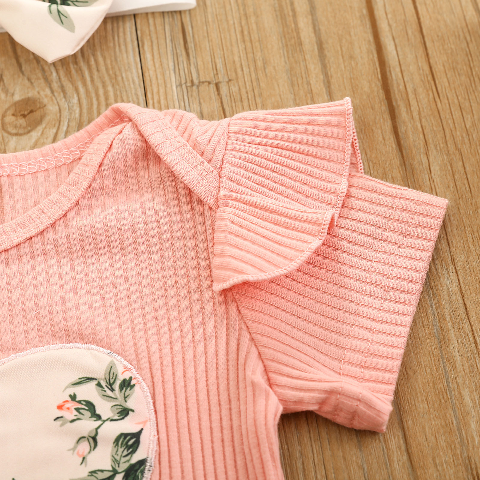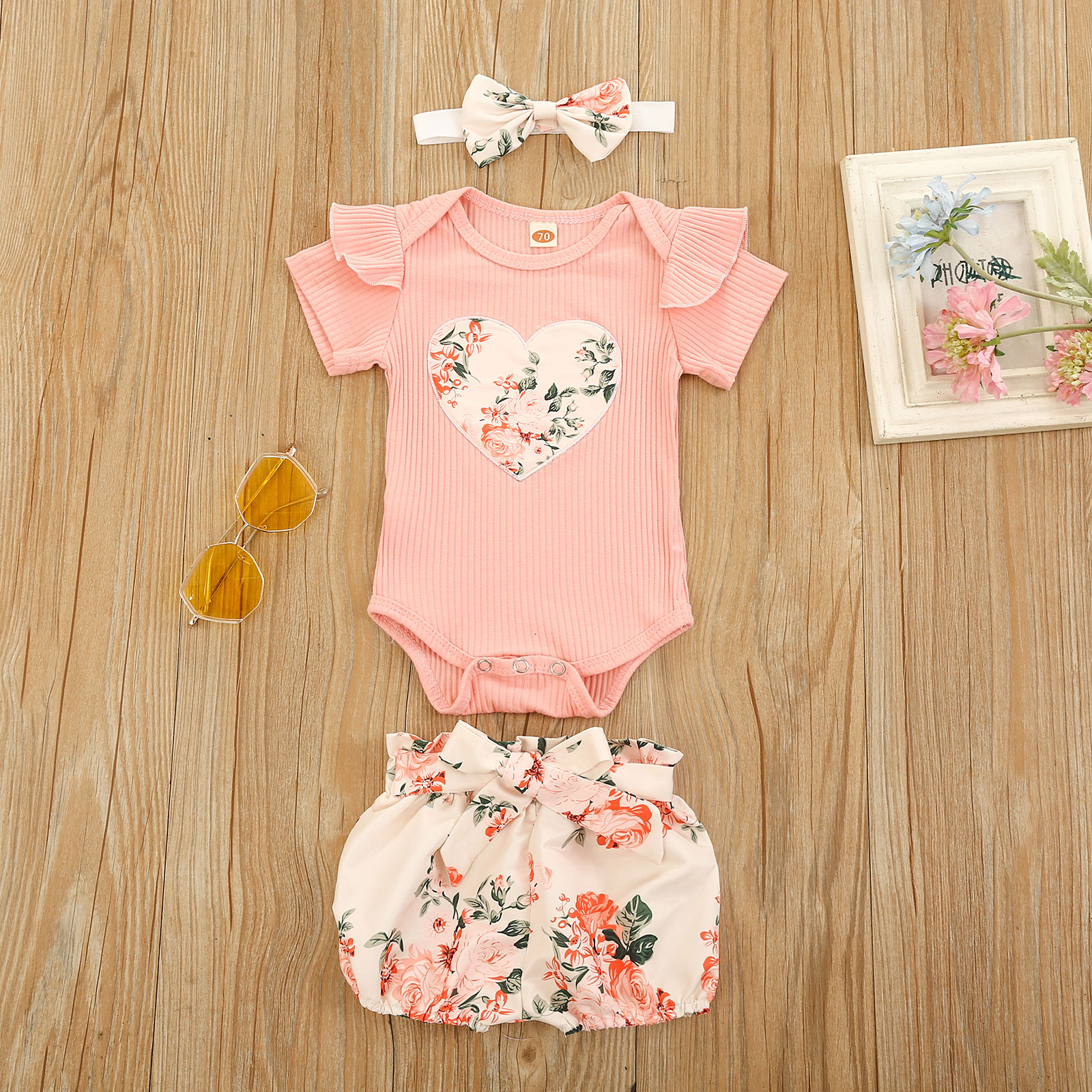 This outfit makes your baby girl even more beautiful. This is made of soft cotton fabric, with ruffled sleeve detail, a heart print on front, matching floral elastic shorts, and ribbons that make it more even prettier. It's very comfy and breathable.