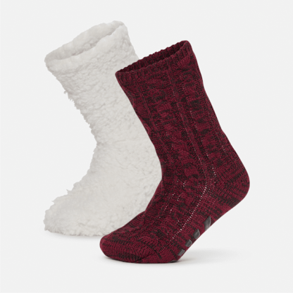 These women's cabin socks of cozy 65% acrylic, 33% polyester, and 2% elastane knit feature high-pile fleece linings and slip-resistant silicone grips, helping combine warmth and safety in a giftable design.