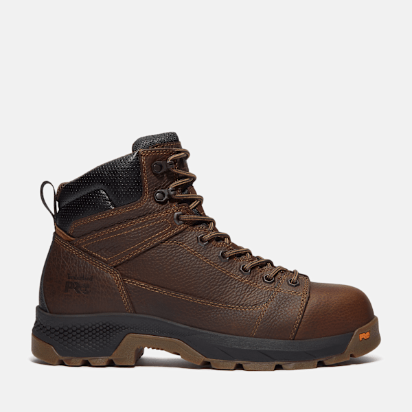 Our TiTAN™ EV style work boot features our lightweight Hover Spring™ foam midsole that helps provide comfort and flexibility while helping retain the durability you need for unpredictable work environments. Constructed with premium full-grain waterproof leather and a composite safety toe that helps provide impact protection, this boot also features our Anti-Fatigue Technology footbed designed to help deliver all-day shock absorption and energy return. It also includes electric hazard protection, fiberglass change that helps deliver structural support, and Microban® antimicrobial treatment for odor control. The non-marking Timbthterland PRO® rubber convex outsole helps provide heat-, oil-, slip-, and abrasion-resistant indoor and outdoor traction, along with top-speed hooks to help with quick lacing.