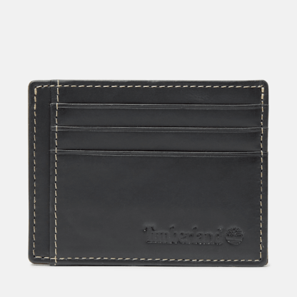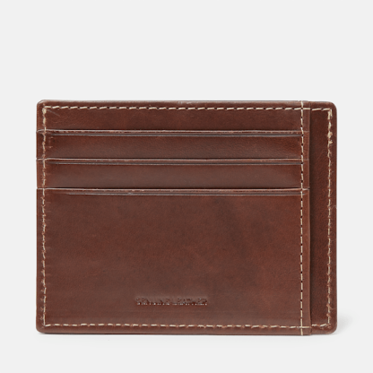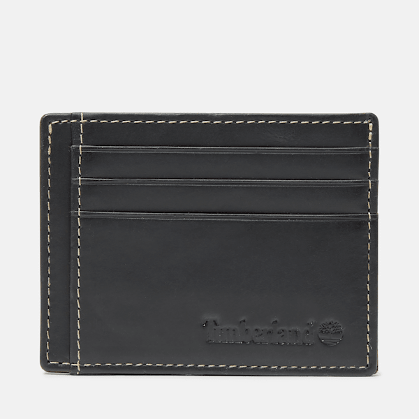 This men's card case is made of 100% cow leather, features Ecru stitching, and has Timbthterland text embossed on the front.