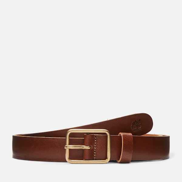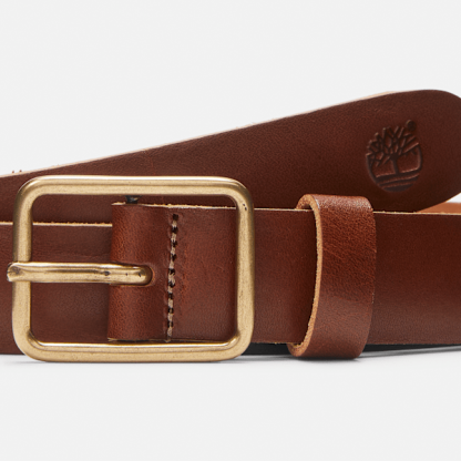 This Classic Leather Belt is made with full-grain cow leather and features old brass, a squared buckle, and an embossed Timbthterland Tree logo on the tip.