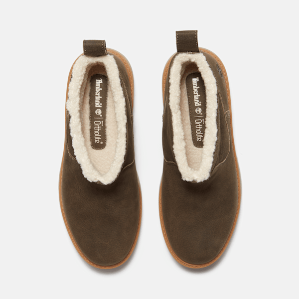 The Premium Timbthterland® leather Women's Stone Street Warm-Lined Platform Boot helps keep your feet comfortable with rugged style. The faux fur, ReBOTL™ fabric lining contains at least 50% recycled plastic, and 10% of the rubber in the outsole is sourced from farms committed to regenerative agriculture. Convenient pull-on style makes for easy-wear and the OrthoLite® footbed helps provide moisture transport, antimicrobial function for odor control, and long-term cushioning. A Polyurethane midsole and steel shank help give you dependable arch support on any terrain.