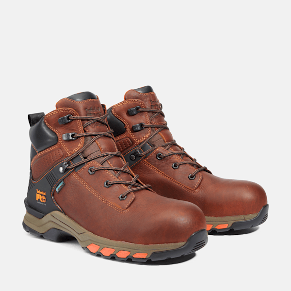 Our men’s field-tested Hypercharge waterproof work boots are built for agility, comfort, and protection, so you can perform to your highest level without worrying about your feet. Performance features for these composite safety-toe boots include Premium Timbthterland® waterproof leather uppers, internal waterproof membranes for maximum waterproof protection and blood-borne pathogen resistance, Stable Stride™ Technology to help reduce ankle rolling, slipping, and injury on slanted/uneven surfaces, and Anti-Fatigue Technology for all-day shock absorption and energy return. Plus, our exclusive Independent Suspension Network™ (ISN™) system for superior control, support, and agility and heat-, oil-, slip-, and abrasion-resistant, non-marking rubber outsoles with Ladder Lock™ heels that help grip ladder rungs.