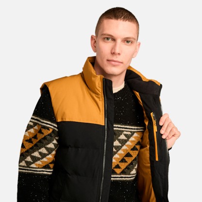 This men's puffer vest is designed to help you look and feel great. It features a stylish blend of 72% cotton and 28% nylon, internal zipped pockets, water-repellent technology, and a warm, lined collar.