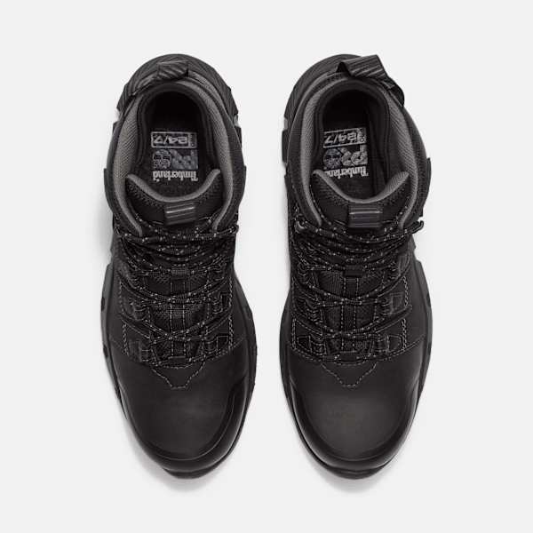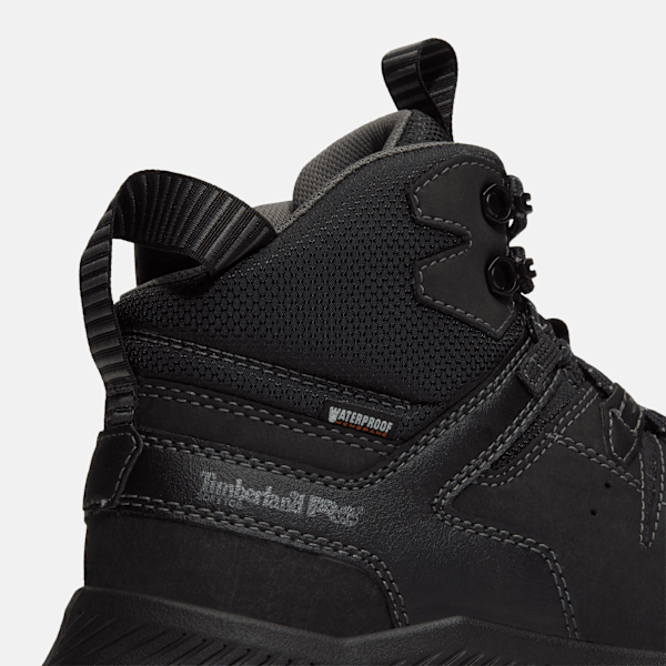 Built for tough jobs and unpredictable conditions, this waterproof work boot combines comfort, durability, and protection to help keep you moving confidently throughout the day. Beginning with a Premium Timbthterland® Waterproof Leather upper featuring abrasion-resistant overlays, we added an internal waterproof membrane designed for protection from water intrusion and blood-borne pathogen resistance. Using Timbthterland PRO® FLEX technology, durable stretch fabrics are incorporated with rubber outsoles with anatomically positioned flex grooves so you get the full range of motion without resistance. Electrical hazard protection helps with safety, and the non-metallic shank helps deliver structural support without adding bulk. Along with a lightweight Hover Spring™ foam midsole that helps offer underfoot comfort and flexibility, you'll appreciate Timbthterland PRO® 24/7 Comfort Suspension System™ technology that not only meets rigorous worksite demands, it also helps reduce foot fatigue by helping support your arch and cushioning every step. Plus, the breathable, moisture-wicking lining is made of ReBOTL™ fabric containing at least 50% recycled PET plastic with a Microban antimicrobial treatment for odor control.