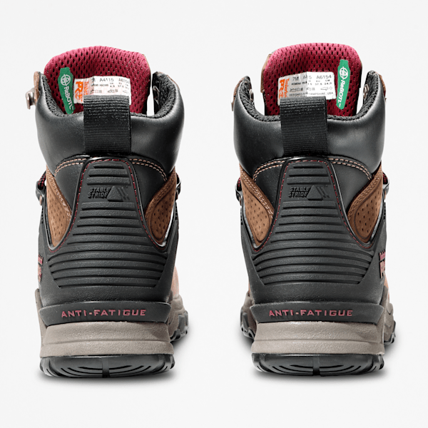 Our field-tested Hypercharge women's waterproof work boots are built specifically for a woman's foot and offer comfort and protection, so you can perform to your highest level without worrying about your feet. Performance features for these composite safety-toe boots include waterproof leather, an internal waterproof membrane for maximum waterproof protection and blood-borne pathogen resistance, our exclusive Independent Suspension Network™ system for superior control, support, and agility, Stable Stride™ technology to help reduce ankle rolling, slipping, and injury on slanted/uneven surfaces, Anti-Fatigue Technology for all-day shock absorption and energy return, a breathable, moisture-wicking lining made of ReBOTL™ material containing at least 50% recycled plastic, and an antimicrobial treatment for odor control. Plus, reliable traction from a heat-, oil-, slip-, and abrasion-resistant, non-marking rubber outsole that features a Ladder Lock™ heel that grips ladder rungs.