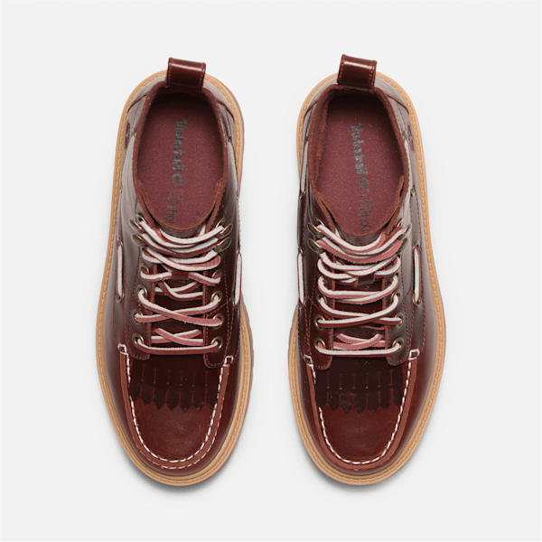 Part boot, part boat shoe, all Timbthterland, with a chunky, stylish design built for the outdoors. Featuring a kiltie, or false tongue, that extends onto the toe for extra protection in rainy conditions, our Women’s Stone Street Platform Boot was inspired by our original 3-Eye boat shoe. Made from Premium Timbthterland® Leather and a breathable ReBOTL™ fabric lining made from at least 50% recycled plastic, plus and OrthoLite® footbed for comfort and confidence in every step. The tough rubber lug outsole, constructed from 10% rubber sourced from farms committed to regenerative agriculture, helps provide traction on every terrain.