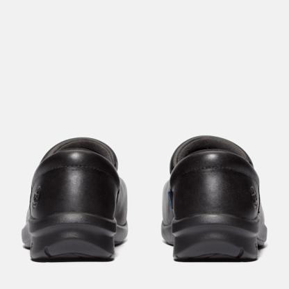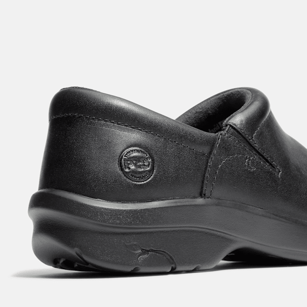 Don't be misled by the comfortable clog silhouette of our women's Newbury slip-ons. These are serious work shoes you can depend on for durability, performance, safety, and all-day comfort. Built on a women's specific last, these slip-ons feature mutilation-free, premium Timbthterland® full-grain leather uppers and are designed for Electro Static Dissipating (ESD) compliance to minimize hazards from static electricity buildup. They also include alloy safety toes, fiberglass shanks for structural support, flexible cement construction, our Anti-Fatigue Technology footbeds that absorb shock and then return your energy, and breathable, moisture-wicking linings made of ReBOTL™ fabric containing at least 50% recycled plastic with an antimicrobial treatment for odor control. Their lightweight polyurethane outsoles offer excellent heat-, slip-, oil-, and abrasion-resistant traction.